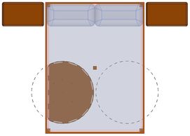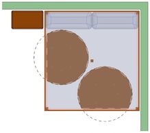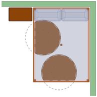 Small x 2 : Queen bed against the wall. One platform under the side and a second platform at the foot of the bed. (above image) Fits a queen 4 post bed with or without one center post. The platform is 39 inches by 29 inches, allows up to 10 inches of the platform to be spun out from under the bed for easy access. We recommend a minimum of 5 1/2 inches of clearance under the bed, 7 or more is optimal.