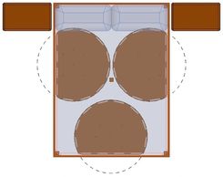 Medium x 2 : King bed with one platform under the side and a second platform at the foot of the bed. (above image) Fits a king 4 post bed with or without one center post. The platform is 45 inches by 35 inches, allows up to 10 inches of the platform to be spun out from under the bed for easy access. We recommend a minimum of 5 1/2 inches of clearance under the bed, 7 or more is optimal.