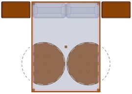 Small x 2 : Queen bed with one platform under each side. (above image) Fits any queen size bed with one or more posts down the center. The platform is 39 inches by 29 inches, allows up to 10 inches of the platform to be spun out from under the bed for easy access. We recommend a minimum of 5 1/2 inches of clearance under the bed, 7 or more is optimal.